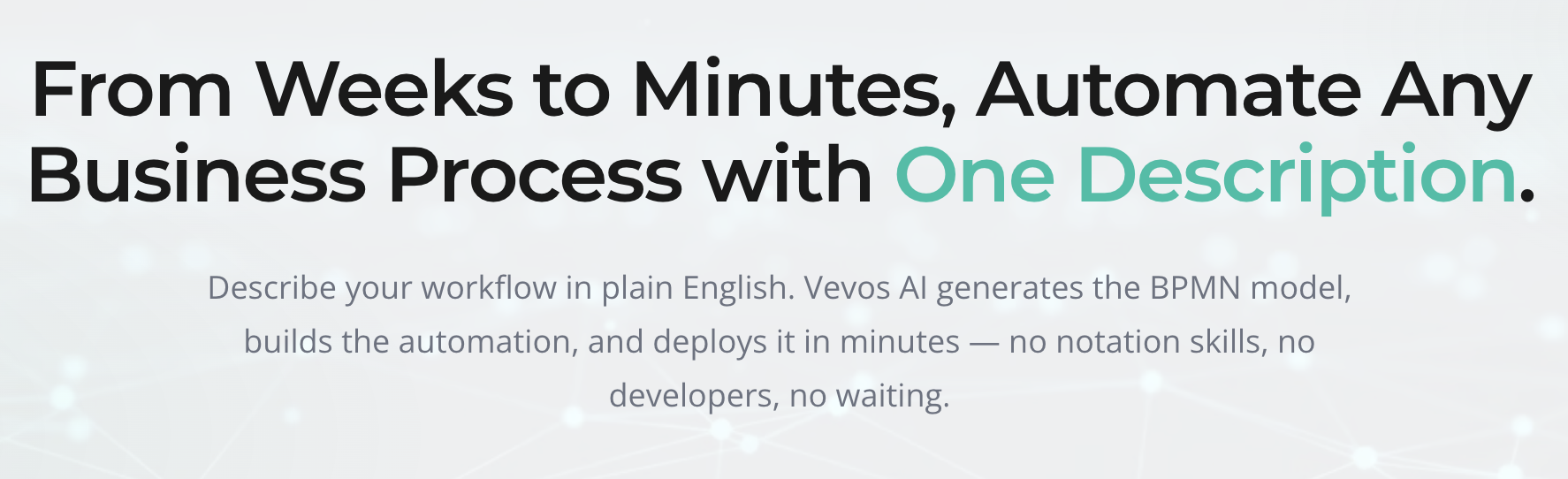 Vevos's approach reverses the sequence. Process discovery happens in plain English, through conversation. Documentation and BPMN process maps are generated, not drawn. The review cycle is between domain experts and a readable artifact, not between a developer and a requirements document written six weeks ago. And execution follows sign-off automatically, through Conductor Agents that build and deploy without human coding effort.
